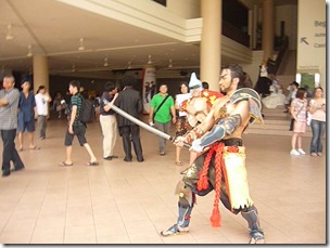 Drefan ’s awesome cosplay of Mitsurugi from Soul caliber 4! I absolutely hates taking photographs inside the Dome =_=. This pic is hilarious cos it looks liek DRefan is cutting the head of that guy off =X Sorry to random passerby, that was not deliberate.